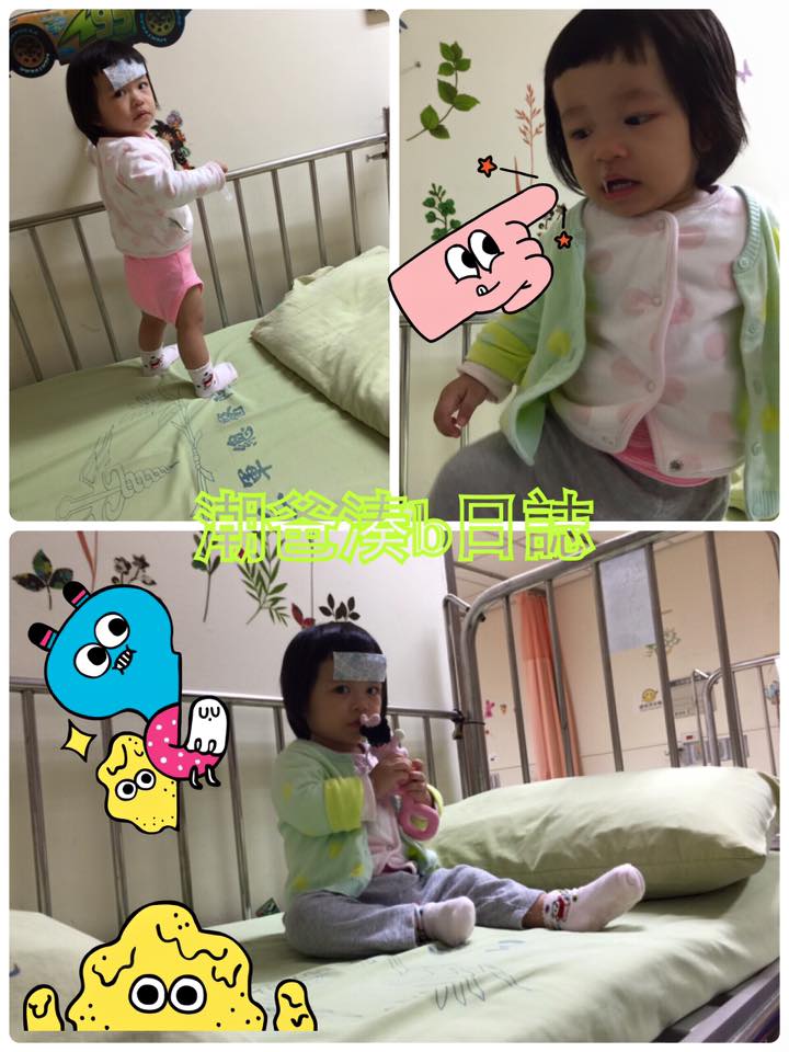 離家最近的三軍總醫院,不消十分鐘便到達,登記後馬上見醫生,檢查一下後,體溫攝氏38.9度,有燒!另外醫生說要驗尿,看看有什麼病毒在囡囡體內以策安全。小朋友不是説有尿尿就馬上有,又未識表達自己去完尿尿,於是姑娘幫囡囡貼一包「尿貼」(用來收集尿尿。之後姑娘就叫潮爸先餵一次退燒藥,然後就不停給水囡囡飲,希望快一些可以有尿尿。在醫院,都沒有甚麼可以玩,一邊在等尿尿,一邊用手機播YouTube 給囡囡看。吃完藥,大概半小時後,潮爸請姑娘再量體溫,37.9度,大家就馬上鬆曬。退了一點點燒,囡囡就愈精神,有其他小朋友亦是發燒來睇醫生,囡囡又開始不停跟其他BB打招呼,但不像去打預防針那麼開心,因為BB們都病到冇曬表情。