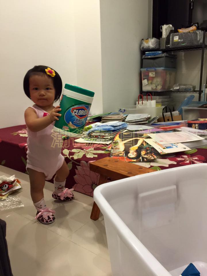 在拆88箱物品時,可以讓囡囡可觸碰的都放在床墊上,囡囡很喜歡那盒濕紙巾,初時抱著走來走去,最後就幫忙遞給潮爸,十分可愛。